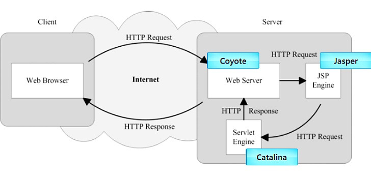 - Coyote : HTTP 1.1 protocol Web Server : Web Browser 와 Server 간의 HTTP 통신(Req/Res)을 담당