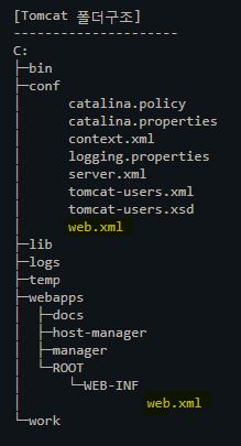 - conf : webapps 에 적용하는 전역 설정. 설치시 다음을 기본으로 제공