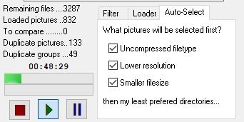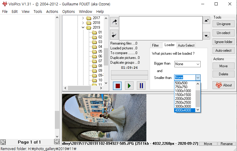 참고로 사용시 주의해야 할 점은 'Loader' 설정 부분입니다. 기본 설정은 50x50 보다 큰 사진 또는 4000x4000 보다 작은 사진만 선택해서 중복 체크가 가능하도록 되어 있는데 이 설정을 None으로 바꿔야 여러 해상도에서도 중복체크를 할 수 있습니다. 이 옵션이 있는 이유는 파일이 너무 많은 경우 프로그램이 정상적으로 동작하지 않기 때문 또는 시간이 오래 걸리기 때문으로 보입니다.