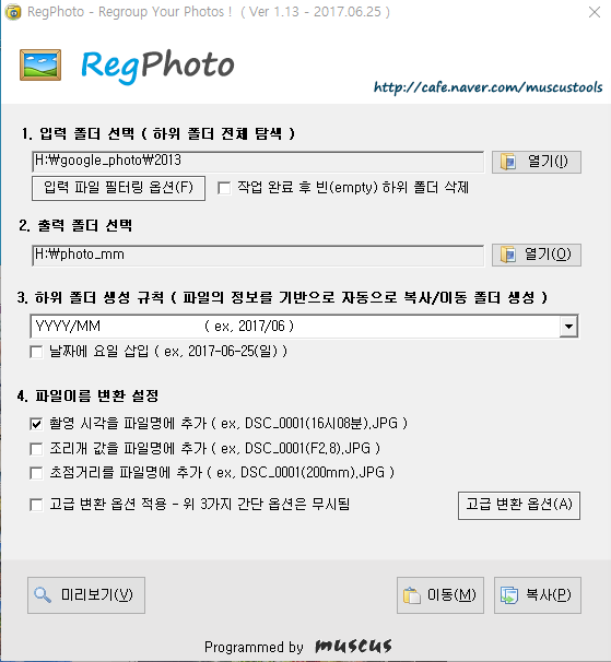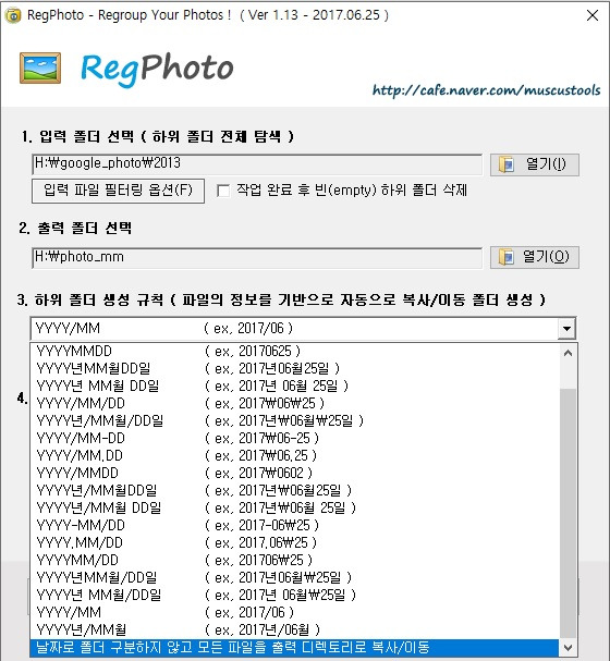 프로그램 기본 실행화면입니다. 별도의 설치가 필요한 프로그램이 아니고 바로 실행할 수 있습니다. 필자의 경우 연도별로는 사진을 대충 정리해놨었는데 연도별로 쌓인 사진이 많다보니 월별로 다시 정리하고 싶었습니다. 그래서 입력 폴더에 기존에 연도별로 모아두었던 폴더를 선택했습니다. 그리고 출력 폴더는 임의로 만든 월별 정리 폴더를 선택했습니다. 3번에 있는 하위 폴더 생성 규칙을 보면 여러 옵션을 선택할 수 있습니다.
