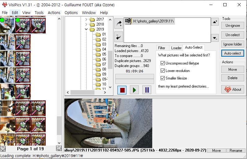 프로그램을 실행하면 중복파일을 찾을 폴더를 선택하는 탐색기가 보입니다. 이 탐색기에서 원하는 폴더를 선택해서 + 버튼을 이용해 작업 목록에 이동해놓습니다. 그리고 중간에 있는 Filter 탭에서 중복 정도를 어떻게 판별할 것인지 선택합니다. Strict는 아주 동일한 사진을 찾도록 합니다. '동일'의 기준은 사진이 용량과 사진이 완전 동일한 것과 같은 사진인데 퀄리티가 조금 낮은(용량이 작은) 사진들을 찾게 됩니다. Loose로 단계를 낮추면 '유사한' 사진들을 찾아줍니다. 가령 연속 촬영을 한 경우가 될 수 있습니다. 약간씩 다른데 유사한 사진인 경우를 찾아줍니다. 이렇게 찾은 사진은 왼쪽 창에 나열됩니다. 여기서 지울 사진을 본인이 직접 선택해서 삭제하는 방법도 있고 'Auto-select'라는 기능을 이용해서 자동 선택하는 것도 가능합니다.