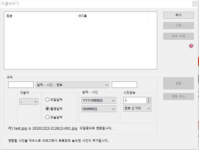 '이름바꾸기' 기능을 선택하면 위와 같은 프로그램 창이 나타납니다. '추가' 버튼으로 이름을 변경할 파일들을 선택할 수 있고 이름 변경 규칙을 선택하는 것이 가능합니다. 저는 날짜-시간-번호로 선택했는데요. 날짜-시간까지 동일한 파일의 경우 뒤에 번호를 붙여서 이름을 바꿔주는 것입니다. 이름을 못 바꾸는 경우엔 그냥 그대로 둡니다. 그리고 변경할 이름을 '촬영날짜'로 선택했습니다. 파일 수정 날짜는 별 의미가 없기 때문에 EXIF 정보가 있는 경우 촬영날짜를 기준으로 이름을 변경해줍니다. 밑에 예시를 보면 파일 이름이 어떤 형태로 바뀌는지 보입니다. 그리고 '변환' 버튼을 누르면 변경이 완료됩니다. 참고로 프로그램이 아주 많은 파일을 추가하는 건 잘 안 되더군요. 몇 개까지 가능한지 확인해보진 않았지만 너무 많은 파일인 경우 파일을 나누어서 작업을 해야 합니다.