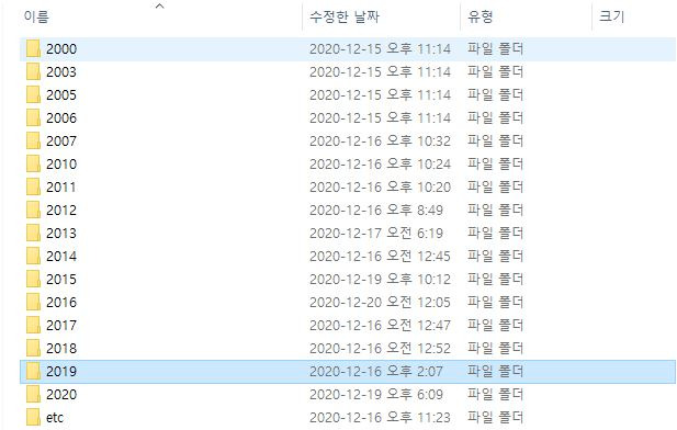 위 프로그램을 이용해서 정리한 폴더들은 아래처럼 되어 있습니다. 먼저 연도별로 다시 폴더들이 만들어져 있습니다.