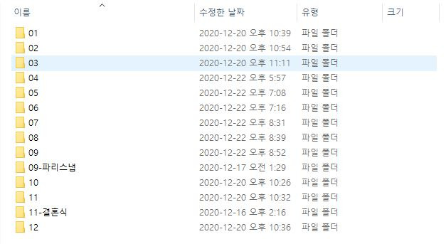 그리고 각 연도에는 월별로 사진들이 분리되어 있습니다. 앞서 언급했듯이 특정이벤트(여행, 결혼식 등)가 있었던 월에는 별도의 폴더를 생성해서 아래처럼 분리를 해놨습니다.