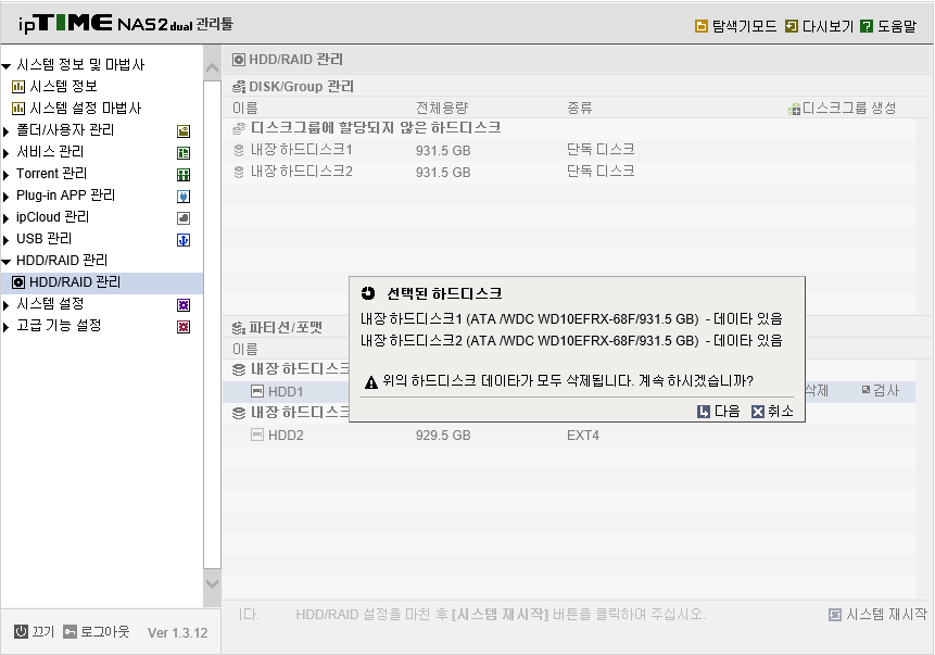 iPtime NAS2 dual RAID 1 구성방법
