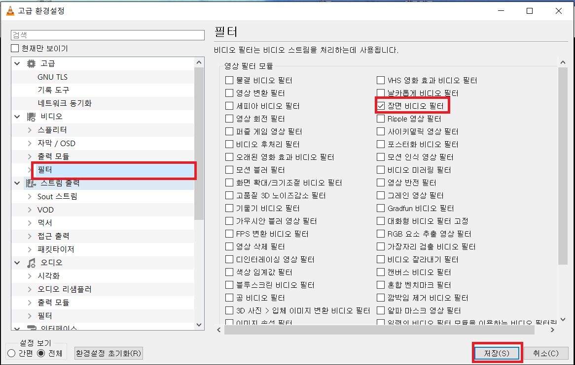 변경된 설정창에 왼쪽 사이드바에 비디오->필터-> 장면필터 클릭
