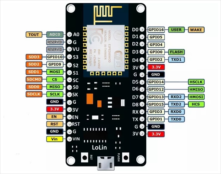 ESP12모듈을 기본으로 사용하므로 ESP12 모듈에서 사용하는 GPIO번호를 그대로 사용헤도 되고 보드에 적힌 A0, D0~D8 라는 명칭을 아두이노에서 처럼 사용해도 된다.