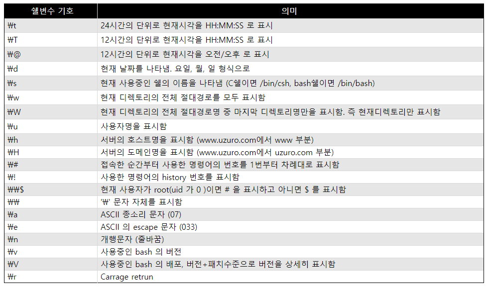 따라서 기본값 PS1은 "[\u@\h \w]$ "가 된다. 그러면 어떤 변수들을 사용할 수 있는지부터 알아보자.