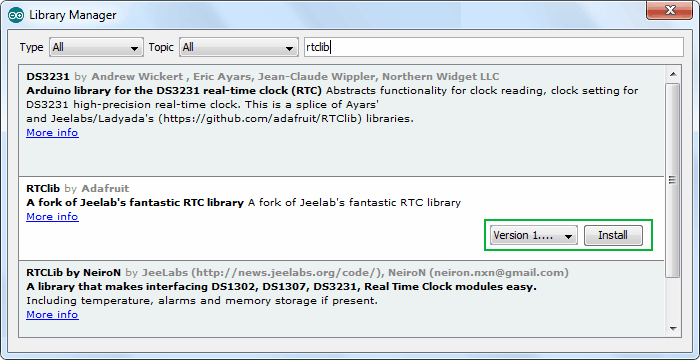 ' rtclib ' 를 입력하여 검색을 필터링하십시오 . 몇 개의 항목이 있어야합니다. Adafruit의 RTClib를 찾으십시오. 해당 항목을 클릭 한 다음 설치를 선택합니다.