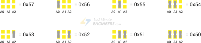 기본적으로 3 개의 주소 입력은 모두 온보드 풀업을 사용하여 HIGH로 풀링되어 24C32에 기본 I2C 주소 인 1010111 Binary 또는 0x57 Hex를 제공 합니다.