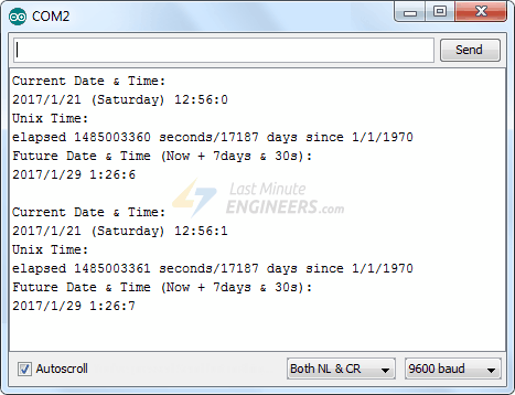 Serial.println("Future Date & Time (Now + 7days & 30s): ");