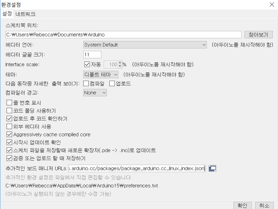 1) 아두이노 IDE가 설치된 후 File – Preferences로 이동 후 다음의 주소를 “추가적인 보드 매니저 URLs” (영어로는 Additional Board Manager URLs)에 포함합니다.