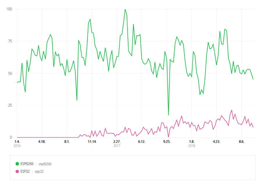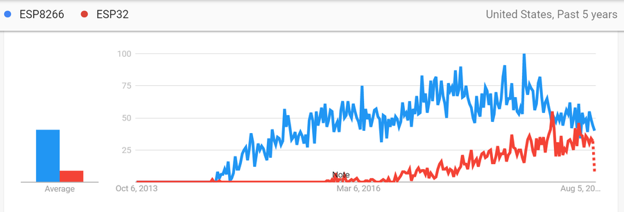 구글 트렌드로 보았을 때, 미국에서는 ESP32가 이미 검색량을 기록하고 있네요.