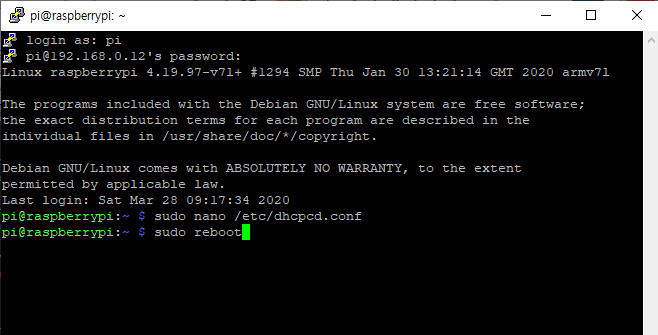 sudo reboot 명령어를 통해 라즈베리파이를 리부팅 시켜줍니다.