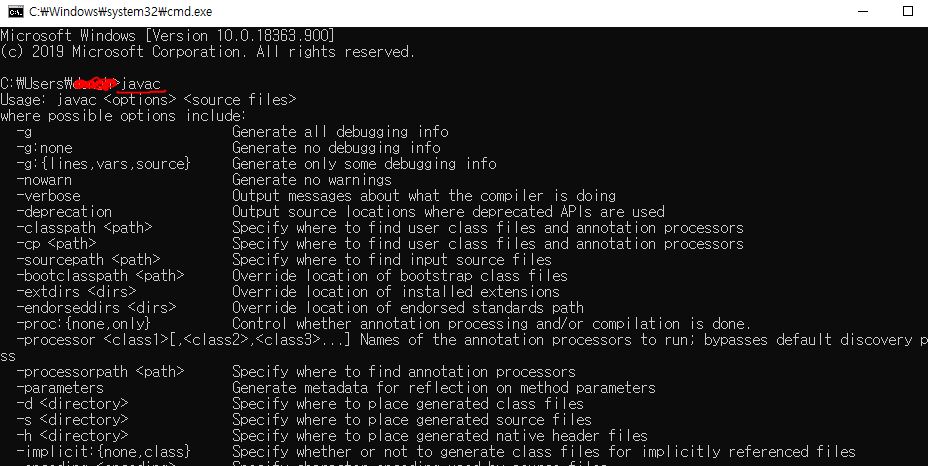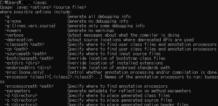 ▲ 그리고 다시 cmd 로 들어가서 "javac" 를 쳐보시면 이렇게 뜨실거에요!!