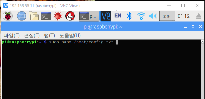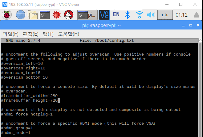 이럴 때 터미널에서 sudo nano(혹은 vi) /boot/config.txt 를 통해 해상도 변경이 가능하다.