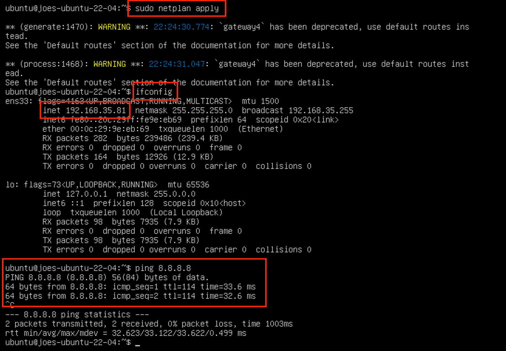 3) "sudo netplan apply" 명령을 통해 설정파일 변경 내용 적용 및 "ifconfig"명령을 통한 IP주소 변경 내용 확인과 "ping 8.8.8.8"을 통해 네트워크 정상 작동 여부 점검 (8.8.8.8은 구글 DNS주소)