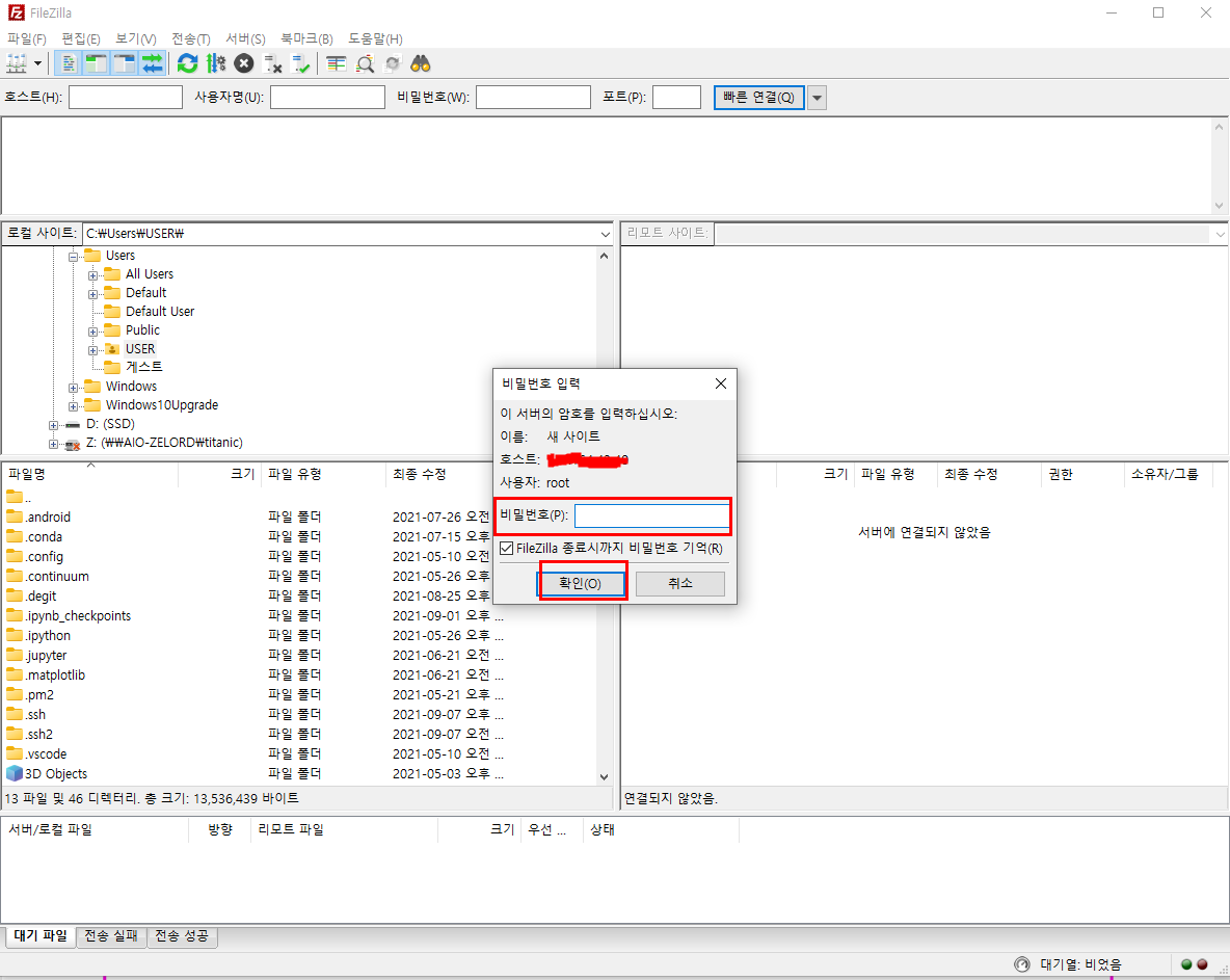 사이트 관리자로 이동하였으면 프로토콜을 SFTP로 변경하고, 호스트에는 서버 IP, 포트에는 22(SSH), 로그온 유형은 일반 사용자에는 계정을 넣고 확인버튼을 누른다.