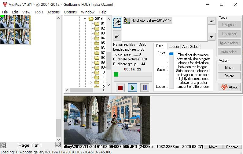 프로그램을 실행하면 중복파일을 찾을 폴더를 선택하는 탐색기가 보입니다. 이 탐색기에서 원하는 폴더를 선택해서 + 버튼을 이용해 작업 목록에 이동해놓습니다. 그리고 중간에 있는 Filter 탭에서 중복 정도를 어떻게 판별할 것인지 선택합니다. Strict는 아주 동일한 사진을 찾도록 합니다. '동일'의 기준은 사진이 용량과 사진이 완전 동일한 것과 같은 사진인데 퀄리티가 조금 낮은(용량이 작은) 사진들을 찾게 됩니다. Loose로 단계를 낮추면 '유사한' 사진들을 찾아줍니다. 가령 연속 촬영을 한 경우가 될 수 있습니다. 약간씩 다른데 유사한 사진인 경우를 찾아줍니다. 이렇게 찾은 사진은 왼쪽 창에 나열됩니다. 여기서 지울 사진을 본인이 직접 선택해서 삭제하는 방법도 있고 'Auto-select'라는 기능을 이용해서 자동 선택하는 것도 가능합니다.